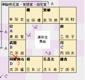 F、命宮與福德宮坐丙干、疾厄宮坐辛干,丙辛天干互動合為忌星,而生年文曲忌在子女宮...(以下略)