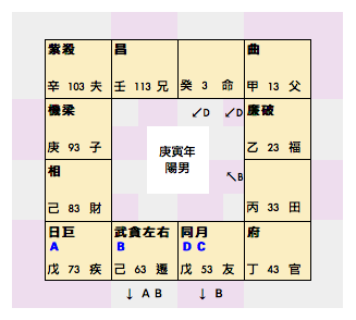 - 福德宮與子女宮天干合化祿,入疾厄宮,而父母宮正好化太陽忌入疾厄宮。這導致幼年時期就很受父母關懷而變得比較依賴(依賴過頭就會顯出嬌寵的個性)。