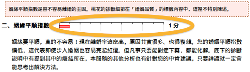 首先在「今生情定姻緣」分析中就可以看出端倪:兩人婚姻平順指數都「只有一分」。