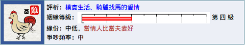 所以簡單看這樣的組合,站在妻子的角度來說屬羊的老公是不錯的,但是站在丈夫的角度而言,則應該要多加考慮。因為「當情人比當妻子好」啊!所以我在分析中也提到:建議您還是要小心謹慎,不要太早決定,至少多交往幾年,除了給自己機會,也是給對方機會。只要不衝動,就更能看清楚對方是不是自己的 soul mate(靈魂伴侶)了。屬雞的對象偏偏正好是丈夫命盤中緣份最差的...