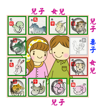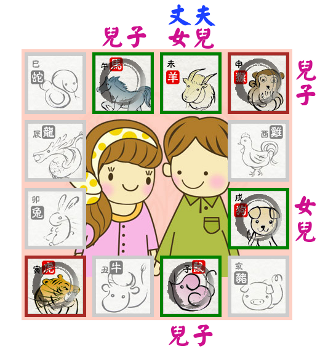 底下把他們家庭中的生肖用文字標示在圖形周圍,其中妻子把丈夫的緣份帶進來(俗稱牽緣),因此家中子女的生肖正好都落在妻子命盤的「因果生肖」中(系統用毛筆畫圈的表示有因果關係),也代表子女與妻子的關係更緊密。